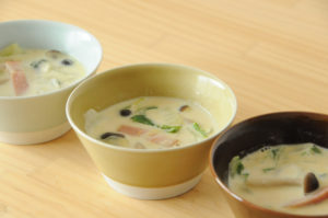 - 1 卵は沸騰後5分ほどゆで、半熟卵を作る