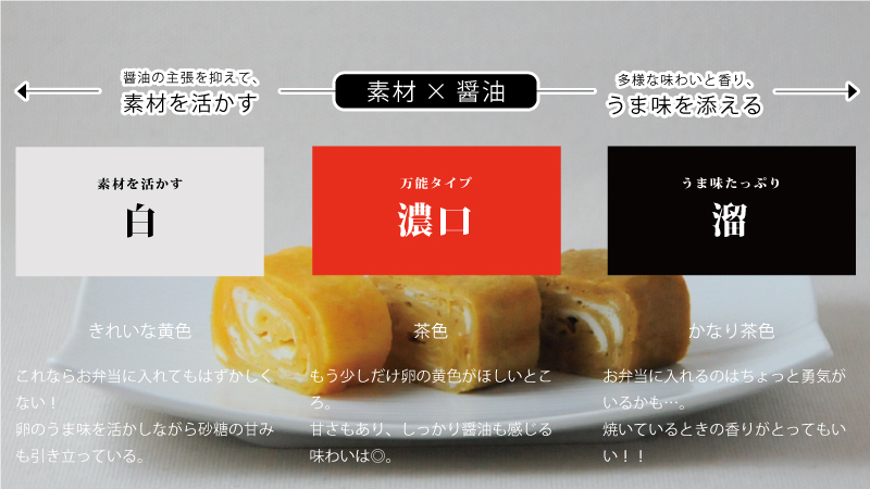 きれいな黄色の卵焼きには白醤油をおすすめしていますが、ほかの醤油で作るとどのくらい色の差があるのか!?そして味の違いは!?実際に3種類の醤油で作って比べてみました。
