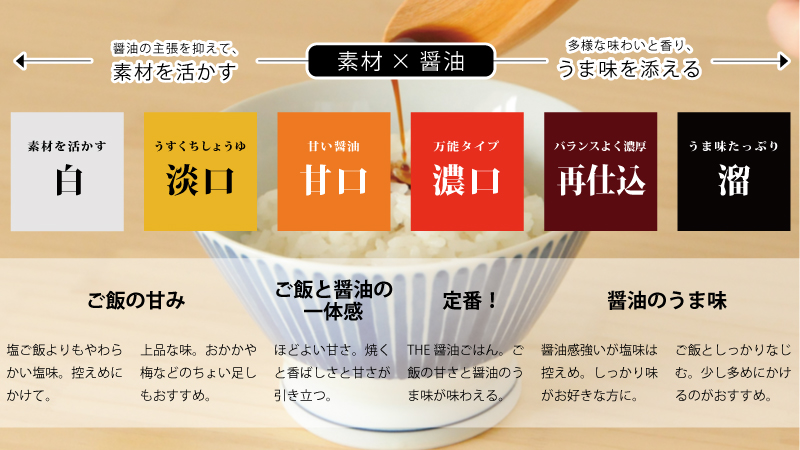 かける淡口醤油といえば「淡紫」。醤油感は強すぎず、いい塩味でご飯の甘みをしっかり感じられます。ご飯のお供との相性もよいので、梅やおかか、海苔や昆布などで醤油ごはんのアレンジもぜひお楽しみください。