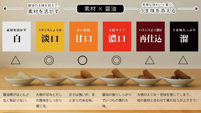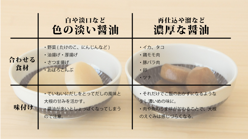 国産大豆と小麦を使用した天然醸造。熟成期間が2年間と長いので、しょっぱさだけが前面に出てきません。大根の煮物は醤油の香りが心地よく、アレンジもしやすいはず。