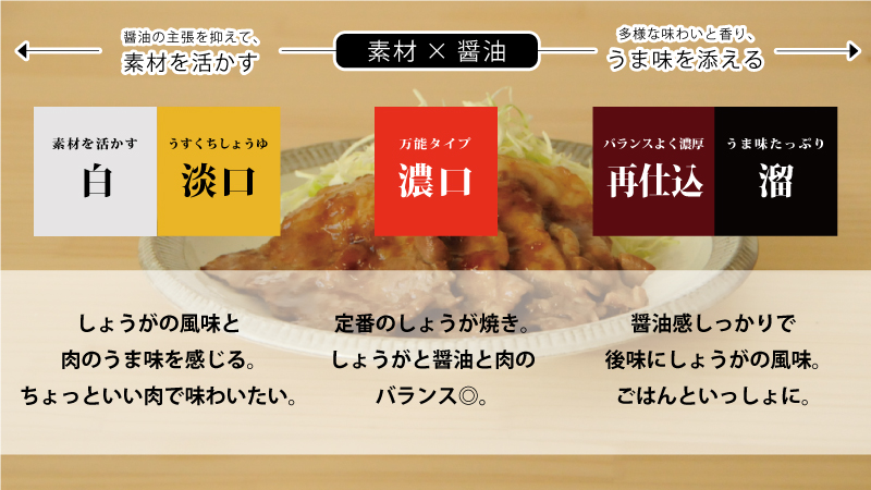 6種類の醤油で作ったしょうが焼きはどれも違った味わい。それぞれに醤油のよさがしっかりでていました。ちょっぴり意外なことに、スタッフ人気NO.1は白醤油。白や淡口はしょうがの風味がしっかりでさっぱりとした味わいです。それとは対照的に、再仕込や溜はごはんの進むしっかり味で、ガッツリ食べたい男性におすすめです。