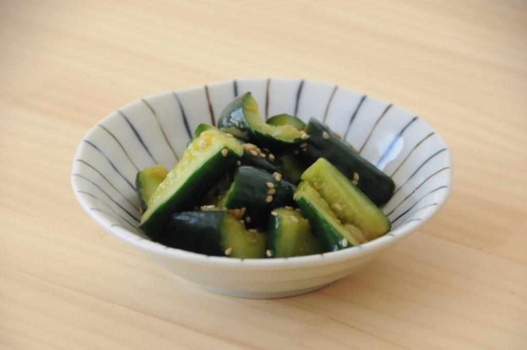- きゅうりをめん棒でたたいて食べやすい大きさに切る