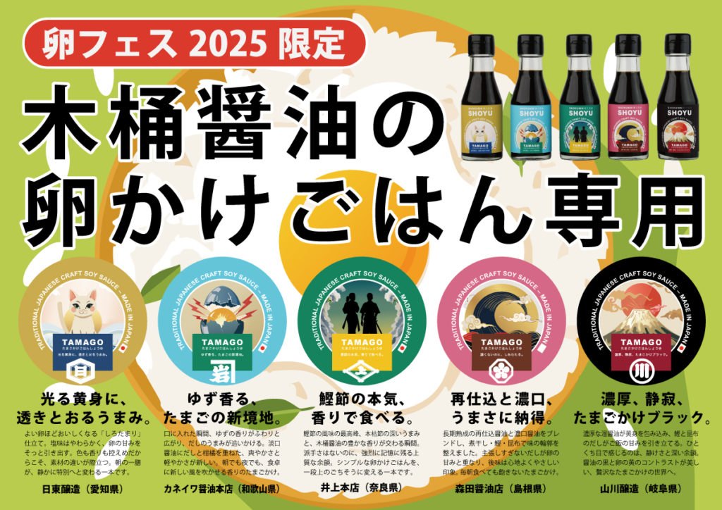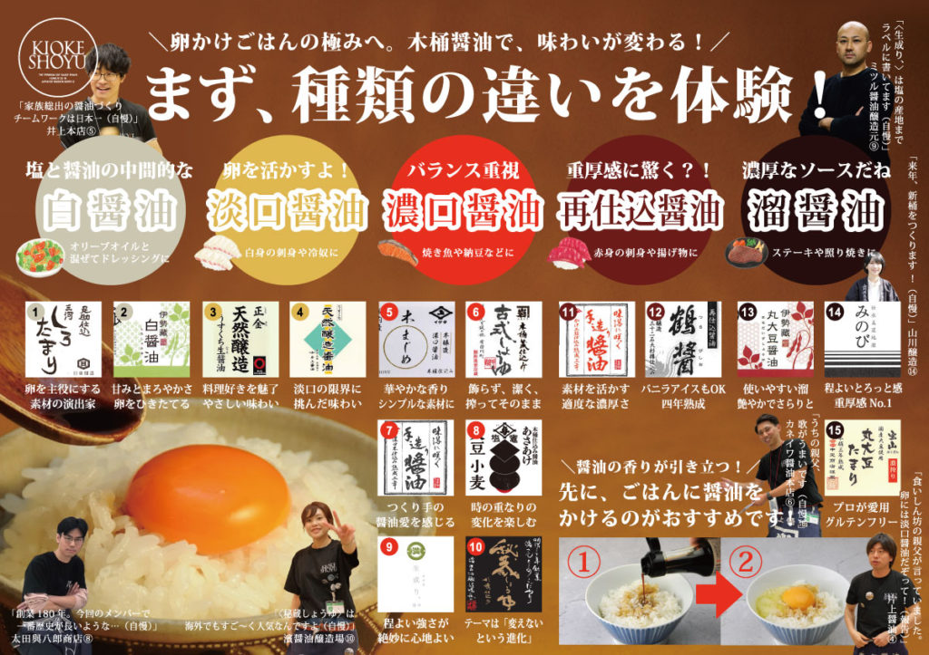 参加者は卵をとって、醤油をかけて、トッピングもお好みで。醤油は白醤油から溜醤油までの5種類の木桶醤油を並べました。