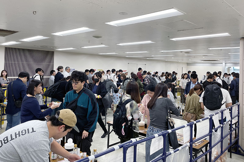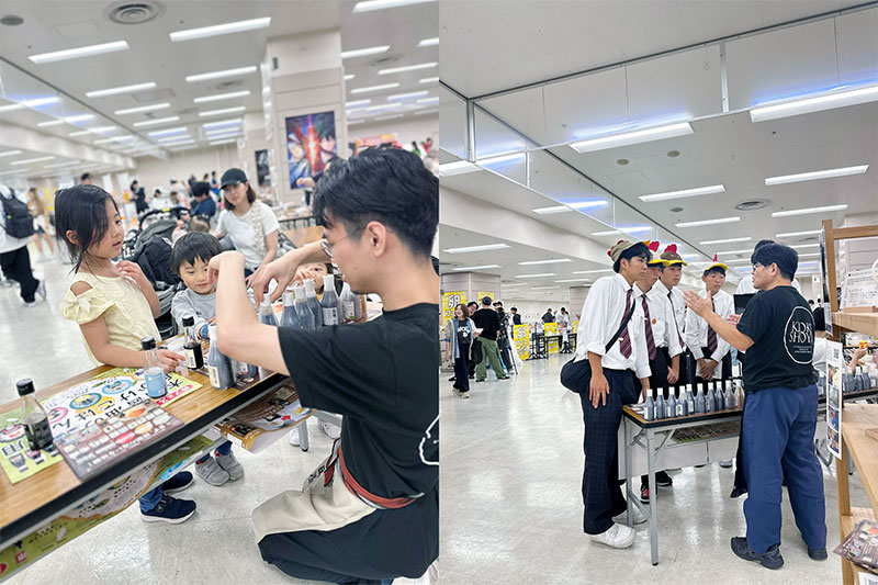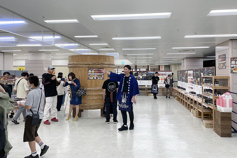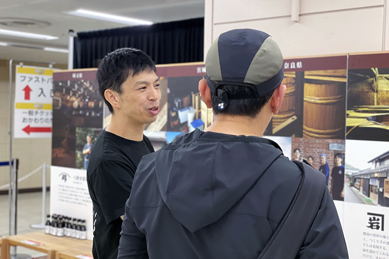 蔵元の解説コーナー。太田與八郎商店の太田岳志さんは子供に人気。そして、岡本醤油醸造場の岡本康史さんは男子高校生に人気。