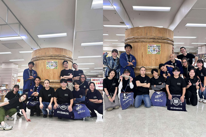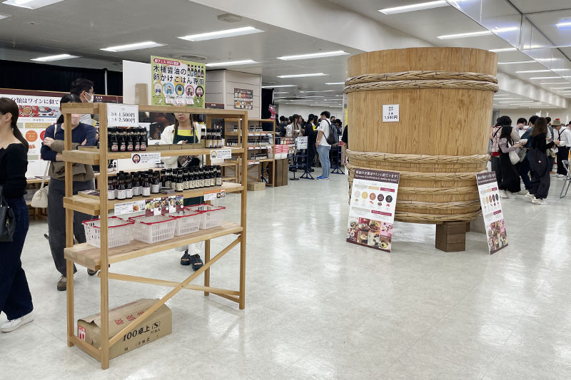 今年はこのようなレイアウト。木桶を中心に蔵元毎に醤油を並べました。