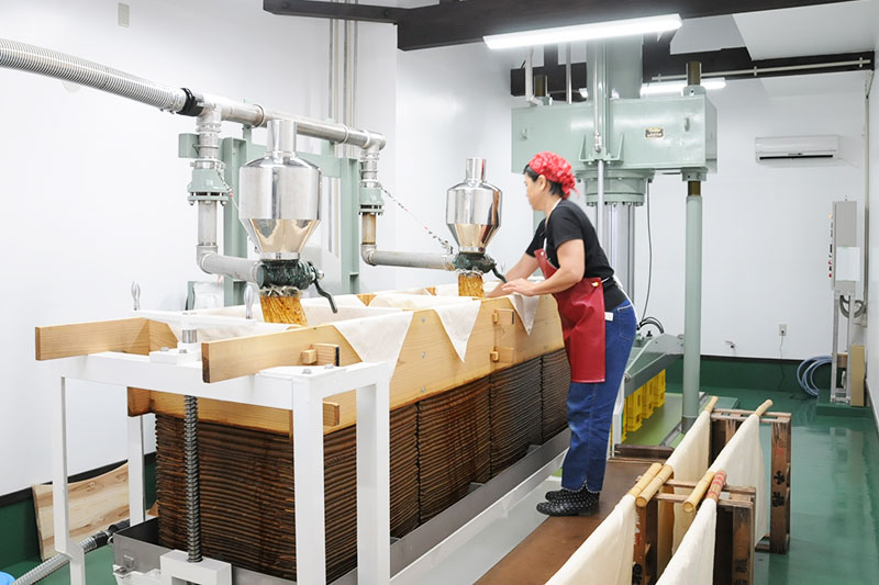 手順は、大きな風呂敷に諸味を注ぎ、四方を折りたたむことで座布団状にします。それを重ねてから圧力をかけることで液体を分離させます。大手メーカーはこれを数百枚重ねて3階建ての建物ほどに高さにできたり、数百メートルの長い風呂敷に包む装置を使えるなどの違いはありますが、基本的な工程は同じです。