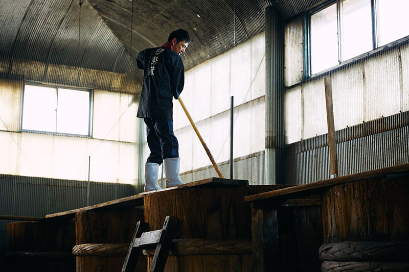 攪拌をすることで白カビ(産膜酵母)を抑制して、微生物が必要とする空気を送り込みます。ただ、かきまぜなくても、かきまぜすぎてもダメ。その年の気温だったり、雨の多い地域/湿気の少ない地域など、蔵の周辺環境にも左右されます。その時々の諸味の様子を観察して、適切に管理をすることが大切とされています。