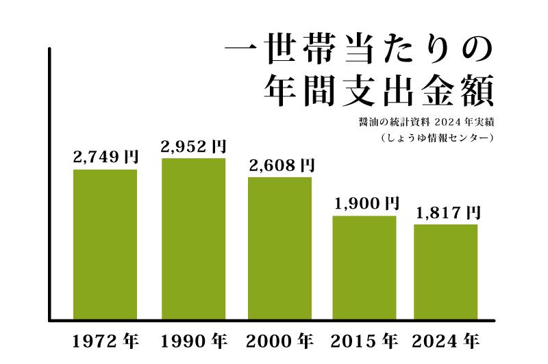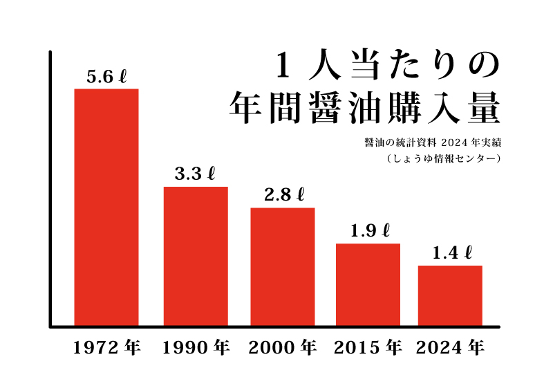 1人あたりに換算をすると、2024年のデータで1.4リットルになります。1ヵ月に換算すると116ml。煮物など醤油をたくさん使う料理をしなくなっていることなどが背景にあるように感じています。