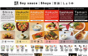 蔵元毎に解説パネルと醤油をセットで並べて、左から右にかけて濃厚な醤油になるように配置しました。そして、お揃いの黒のTシャツを着た蔵人が解説。自社以外の醤油もしっかり説明をしていました。