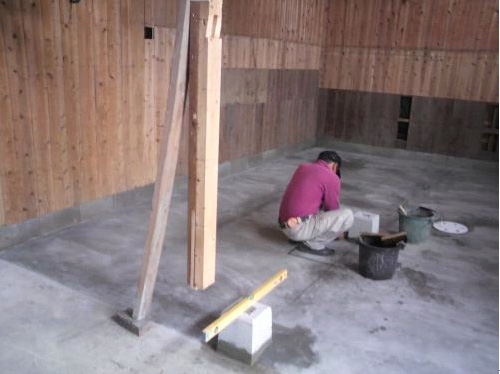 梁の中心から、重りの付いた糸をたらして柱の下に置く「束石」(つかいし)の位置を決めています。 束石をセメントで固定。