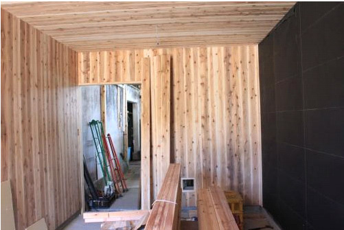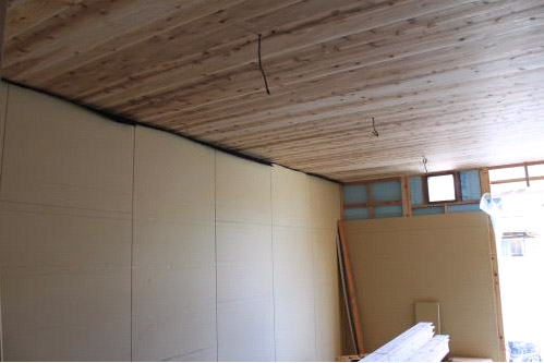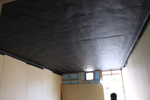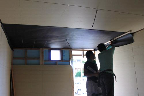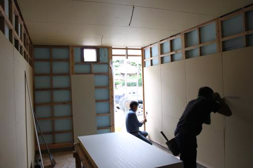 前回入れた断熱剤の上に、石膏ボードという壁材を打ちます。