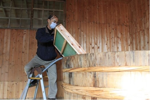 最初の仕込みということで、始めだけ儀式的に麹箱から桶に投入しましたが、