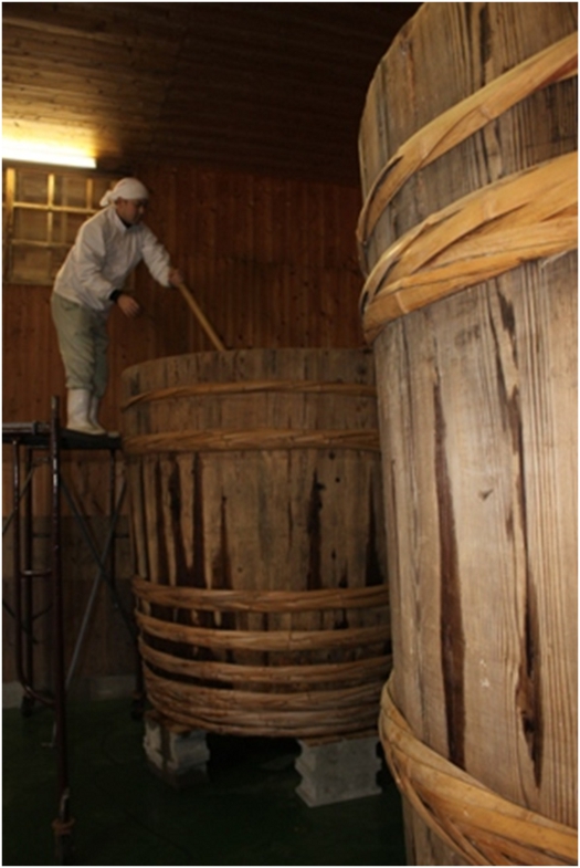 仕込み後、初期は頻繁に諸味の撹拌を行うのですが、この作業を荒櫂(あらがい)といいます。これにより、麹と塩水を良くなじませます。