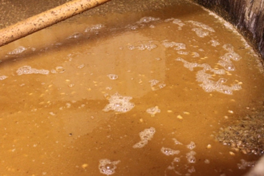 午前中に撹拌した諸味も、夕方にはまた固形物が浮き上がってきます。旺盛に発酵してくれて嬉しいです。