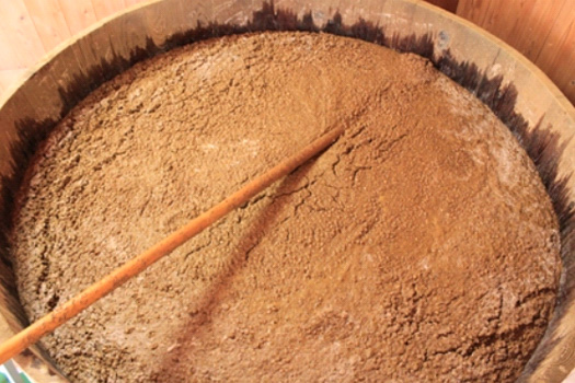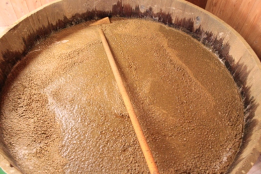 グッと固形物が押し上げられています。数日撹拌してないので表面が少し乾燥気味。そしてうっすら白い産膜酵母が出ます。ぱっと見、味噌みたいでしょ? 表面が固いと櫂がなかなか入って行かず、撹拌が大変なんです。