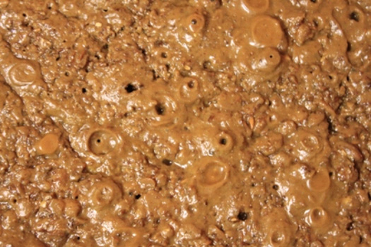 酵母の出す二酸化炭素が下から上がってきて、表面はクレーター状になっています。