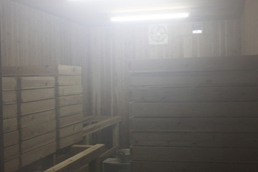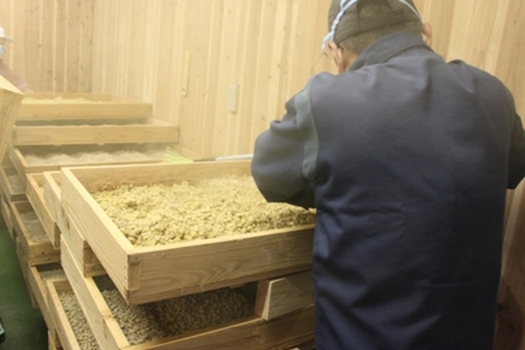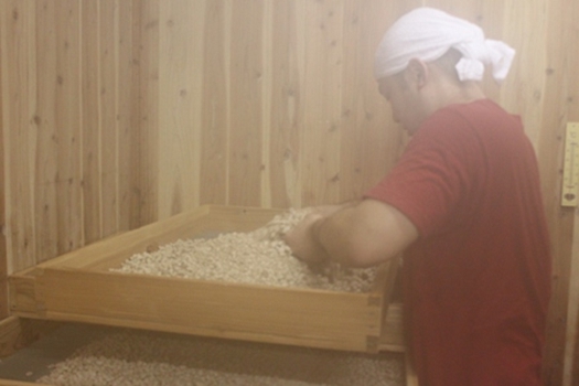 昨日、山状に盛った麹を崩して広げていきます。また、昨日は箱を真っ直ぐに積み上げた棒積みという状態にしていましたが、手入れ後は煉瓦積みという状態にして、熱が逃げやすいようにします。この作業を、午前・午後と2回行います。全工程でこれが一番過酷ですね~。