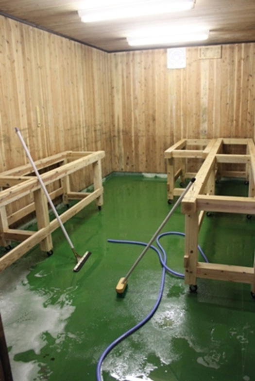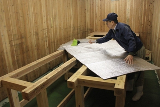 まずは、麹を冷蔵室に移動させ、台にしているベニヤ板とシートを片づけ、棚を移動。