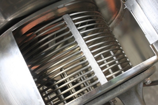機械の構造は、中心の棒の付いたディスクが回転して、崩れた米粒が飛ばされて金具と金具の間を通る物だけ(崩れた米粒)が下に落ちて行きます。ただ、これは米麹用の機械なので当然、米粒に合うように設計されています。