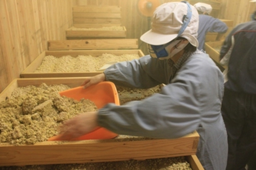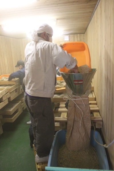 切り返し機に投入→バラバラにほぐれた麹がパレットに入る→仕込み蔵へ運ぶ。という、一連の作業がとてもスムーズにできました。