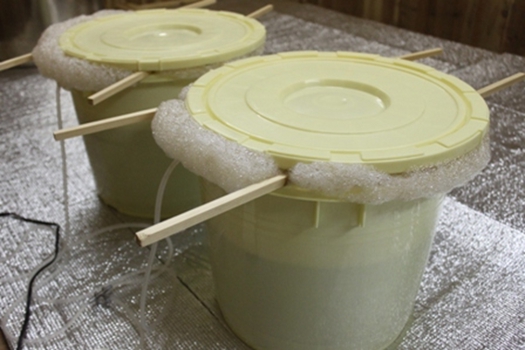この中で、一番見た目の変化が大きいのが主発酵酵母の発酵期です。 酵素によってデンプンがブドウ糖に分解され、そのブドウ糖を栄養源に乳酸菌が乳酸を生成し、その酸でpHが下がり酵母が増殖できる環境となります。 昨年もそうでしたが、うちではこのタイミングで酵母を添加します。 昨年も使った、昔の蔵から分離した酵母を今年も使う事にしました。昨年の諸味は未だに高いアルコールを維持しているので、これはなかなか優秀な酵母です。