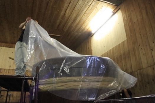 この作業、足場の上にいる僕は楽なのですが、壁と桶の間に入って作業する蒲池さんは、大変です。 (僕は体型の問題で壁と桶の間に入れません…。)