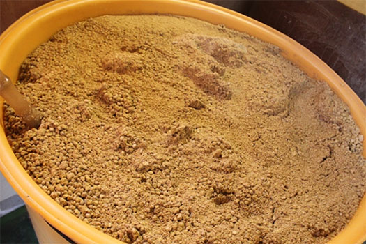 下の写真は、つい先日仕込んだ10水仕込みの諸味です。10水というのは、原料に対する塩水の量の事です。標準的な濃口が12水と言われていて(もちろんメーカーさんによって前後します。)ちなみに、うちは11水です。