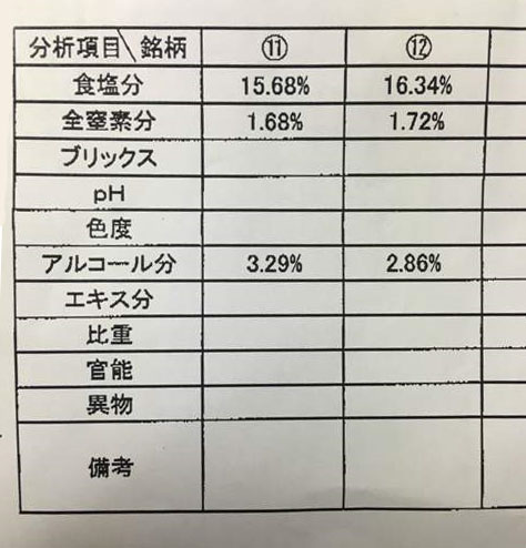 ⑪は試験的にいつもより塩分を低く仕込んだのですが、それによって0.5%以上⑫の塩分が高い中での数字(全窒素)と考えると、近い塩分%で仕込んだ場合には差が明確に出たのかもしれません。また、夏場に諸味の撹拌をしていて⑫の方が酵母の発酵が弱い感じがあり、最終的にもアルコールは⑫の方が低い値になりました。