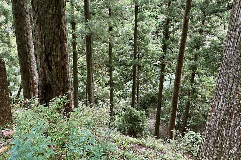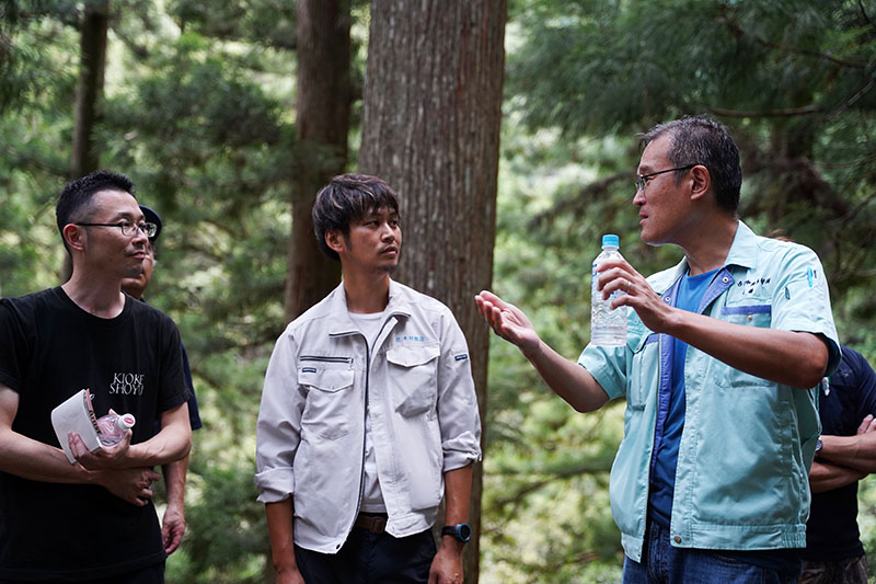 くねくねした細い道をひたすら進んでいくと、急な斜面、そこに等間隔に杉が整然と並ぶ光景が広がっていました。吉野杉の特徴は「密植多間伐」。間隔を狭くたくさん植えると、自らの生存のために太陽を求めて上に上にと伸びていきます。そして、適切なタイミングで間伐して密度を調整するという仕組みです。これを数十年から百年を超える時間軸で行っていきます。