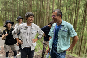 山の麓にある広場からはトラックで陸送されて原木市場に運ばれて競りにかけられます。木材には刻印が押されていて、どの林業家が育てたものか分かるようになっているそうです。それも競りの際の判断基準の一つになっているというので、「山守(やまもり)」の山林管理の技術力を感じます。