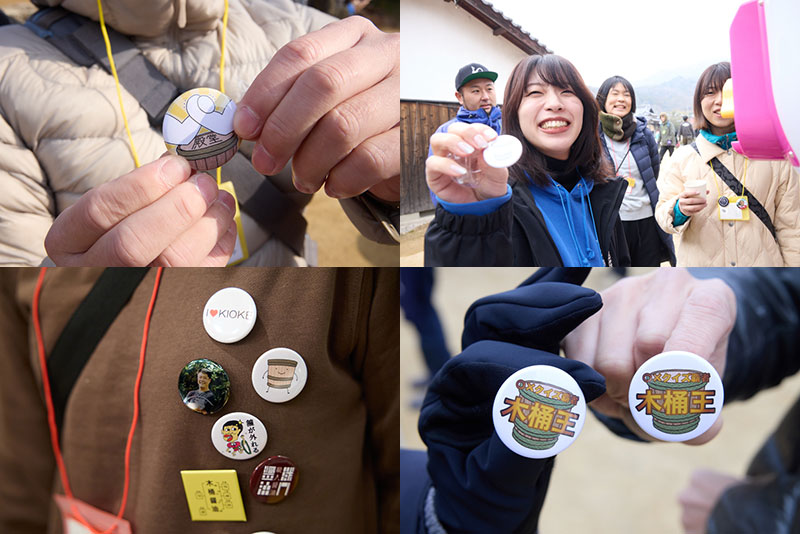 他にも木桶職人の顔写真を缶バッチにして、山本さんや坂口さん(木桶職人の棟梁)はキラキラ仕様にしてみたのですが、期待通りの輝きにはならず…。課題も浮き彫りになりました。