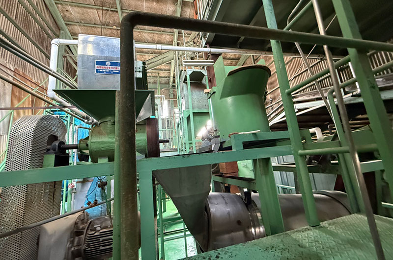 この装置を使って蒸した大豆に種麹を均等にまぶしていく工程が、とても興味深い仕組みになっています。写真左上のシルバー部分にミンチ状の大豆を入れ、右側の緑の筒に入った種麹が、中央部分で大豆全体にムラなく付着していきます。
