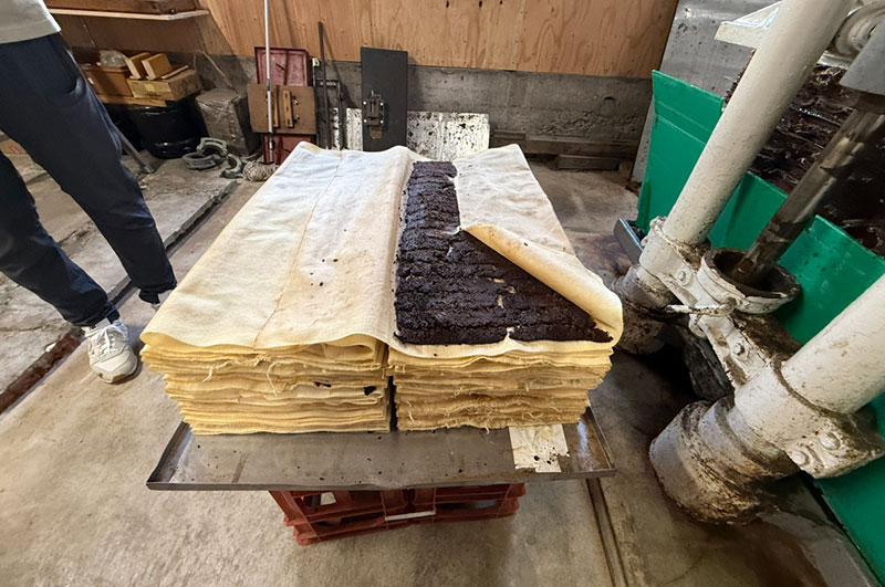 溜醤油の諸味は、生引きを終えているため、一般的な濃口醤油のようなどろっとした状態ではありません。そのため「味噌切り機」と呼ばれる専用の機械で、カッチカチの諸味を数ミリの厚さにスライスしていきます。スライスされた諸味は、厚地の布に挟まれて、何層にも丁寧に積み重ねられていきます。