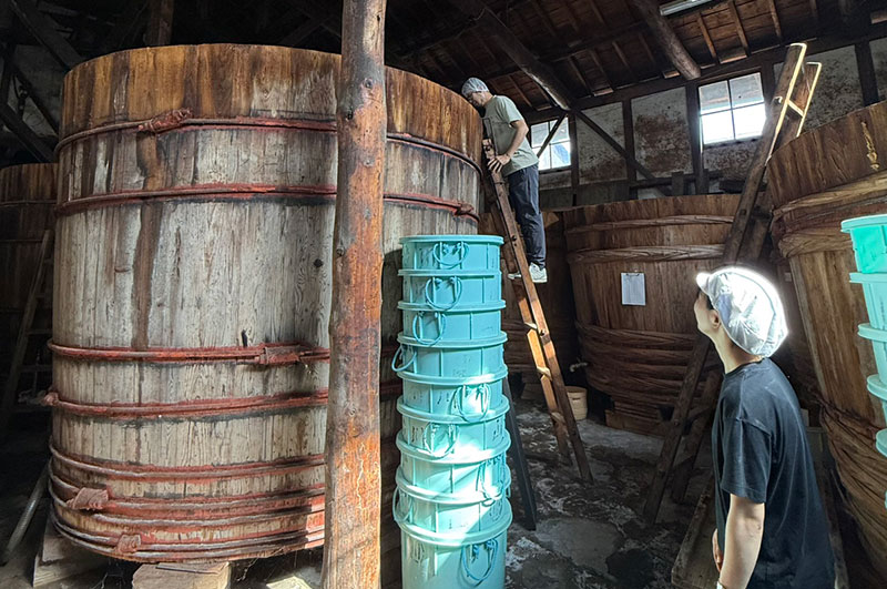 大きな桶の前で語られた、これまでの道のりと、これからへの想い。「伝統を次の世代に繋いでいかなければいけない」と話すその姿からは、確かにこの蔵の未来を担う覚悟が感じられました。