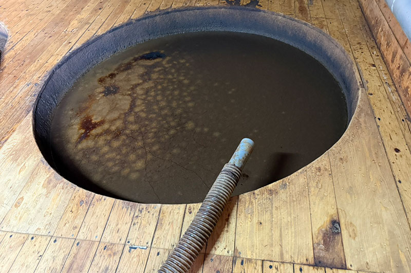 そう言って案内してくださったのは、昨年入れ替えた木桶の床板。よく見ると、一部分だけ床の色が違っていました。木桶職人の仕事は、ただ木桶をつくるだけではない。その桶がきちんと息をして、発酵を支え続けられるように、蔵の環境そのものを整えることも、また職人の仕事なのだということを、あらためて実感しました。