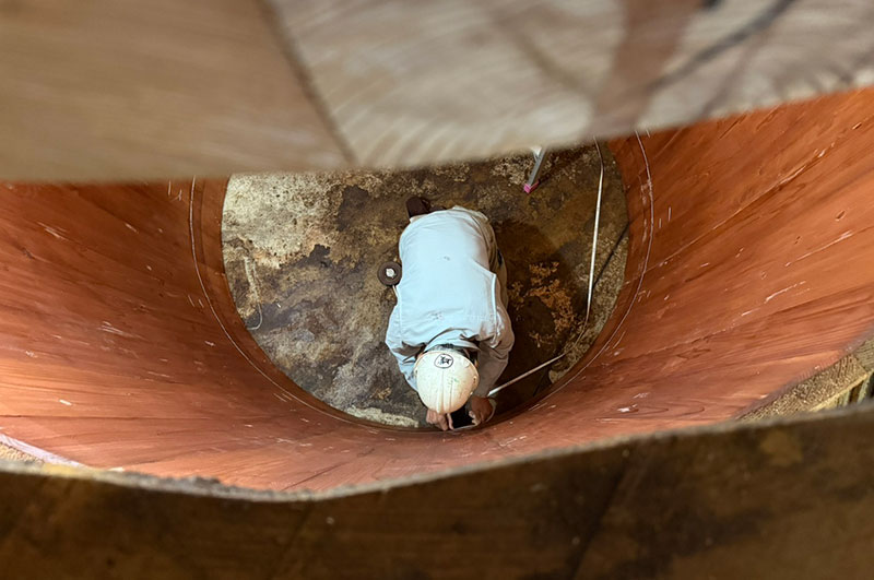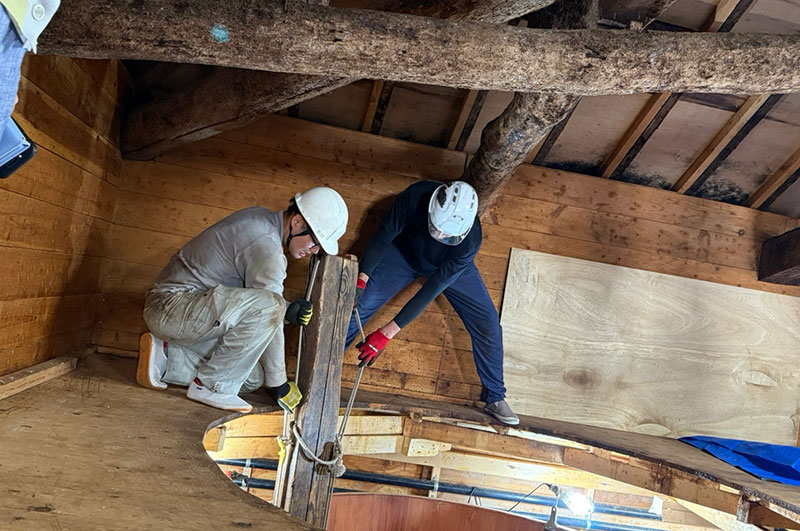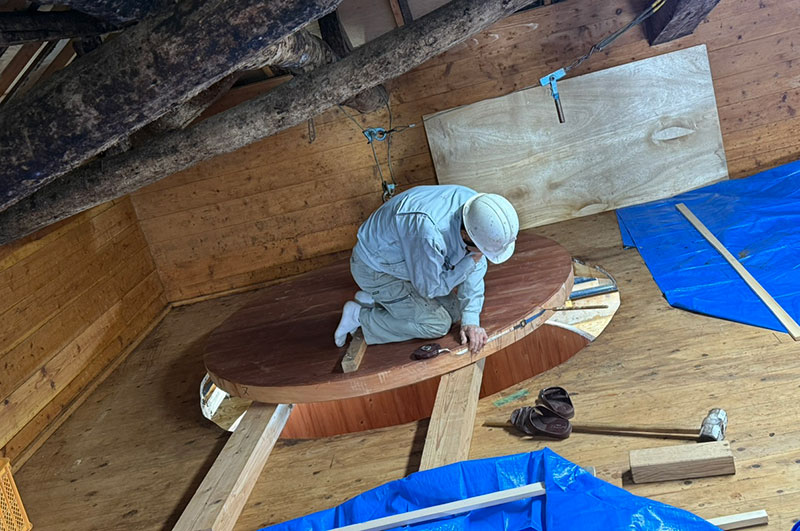 「実はね、以前の桶は楕円だったんです。だからまったく同じサイズで新しい桶を組むのは無理なんです。その分、床板を新しい木桶に合わせて張り替えていきます」