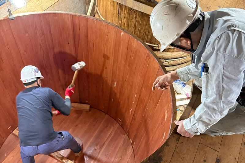 底板が目印の位置まで降りてくると、「あと1センチ、右、左」と、上から上芝さんの声が飛びます。桶の中にいる伊藤さんが、その指示を受けてハンマーで底板を叩き込んでいきます。上芝さんは、底板が水平になったかどうかを、目視での確認とともに叩く音でも聞き分け確かめていました。