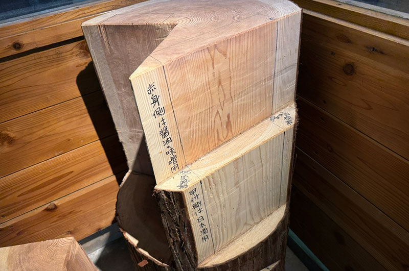 そして、ここで思わず感動してしまったできごとがありました。これまでにもいくつかの醤油蔵を見学してきましたが、「木桶に使われる材木」について、こんなに丁寧に教えていただいたのは初めてのこと。