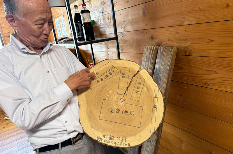 柴沼会長は、木桶で醤油を仕込む伝統だけでなく、木桶の材料として使われる吉野杉の優れた特性についても知ってもらいたいという思いから、この吉野杉の見本を用意してくださったそうです。こちらはなんと、樹齢129年の吉野杉の見本。赤身と呼ばれる部分が、醤油や味噌の桶に使われるとのこと。木の断面を前に、「この部分はここに使われます」と、まるで職人の手元を見ているような細やかな解説に、思わず引き込まれました。