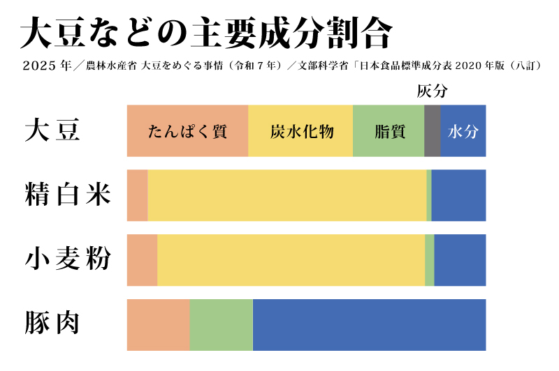 このように比較をすると、大豆のたんぱく質の豊富さがわかります。脂質の多さも米や小麦と比較をすると多いですが、江戸時代など昔の日本人のたんぱく質の摂取源が大豆だったというのは納得できます。