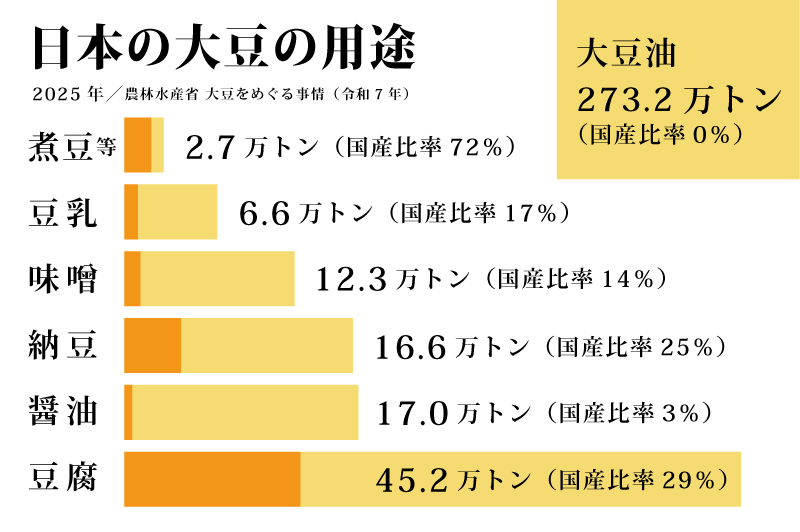 ただ、20年ほど前を比べると増加傾向にあるのは確かだと思います。ちなみに、大豆油に使われるのは豆腐の6倍。日本でもほとんどの大豆は油になっています。