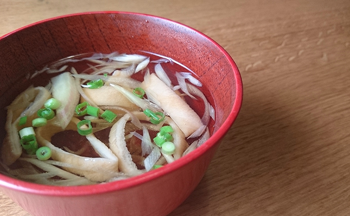 乾燥わかめと麩にお湯を注いで「みそたまり」をちょろっと。お湯を注ぐだけの簡単さなのですが、だしなしで十分おいしくて上品なお吸い物になります。むしろだしがないほうがいいくらいに…。