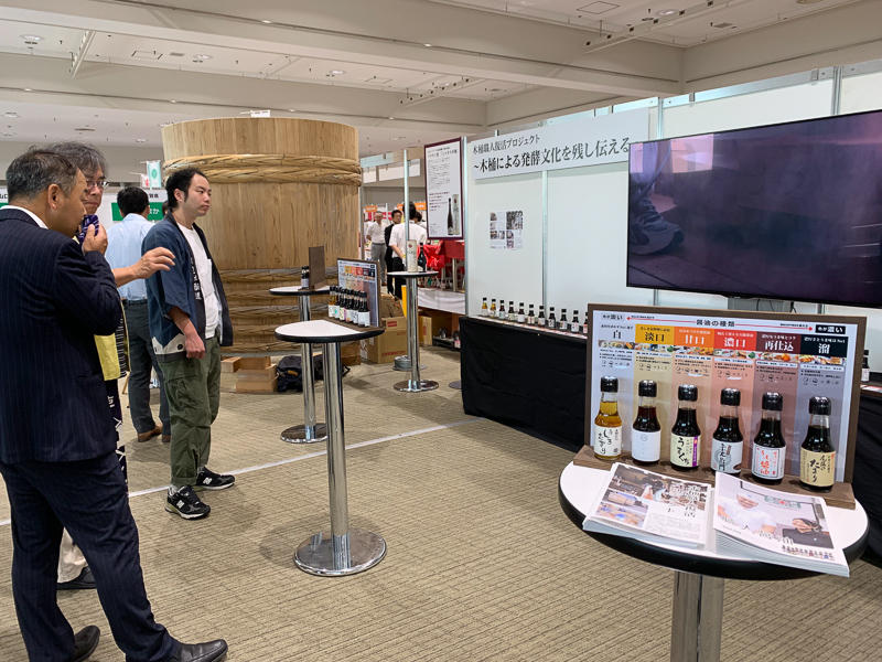先月のパシフィコ横浜に続いて、三井食品さんの大阪の展示会にも木桶を運びました。来場いただく方に桶に触っていただきながら解説。小売店やバイヤーさんをはじめ、日本酒などの桶に関係するメーカーさんにも多く立ち寄っていただきました。