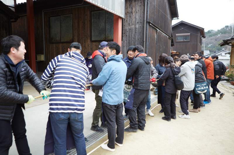 芯づくり。箍の中に入れるものを、皆でくるくる巻いていきます。