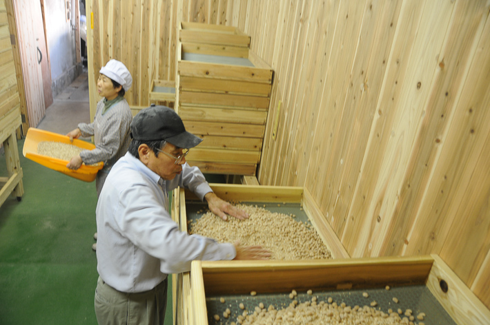 蒸した大豆と炒った小麦に種麹を加えて繁殖させます。麹菌が繁殖しやすい温度と湿度を調整することが職人の仕事。麹菌は自らが成長するために発する熱で死んでしまいます。温度が高すぎても低すぎてもだめで、定期的にほぐして空気を送り込みます。どのつくり手も真剣。
