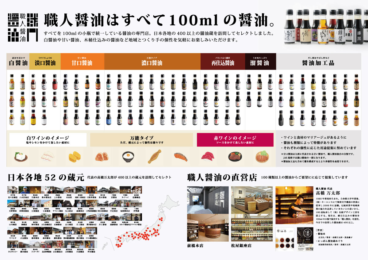 職人醤油はすべて100ml。日本各地の52蔵の100種類の醤油をラインナップしています。醤油の種類毎やおすすめの用途提案などの情報を添えた「醤油の棚」をご提案します。